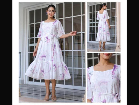 Jenesiya White and Lavender Floral Midi Dress with Tie Belt